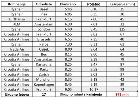 U spomenutom razdoblju ukupno je generisano 978 minuta kašnjenja na svih 17 linija, pri čemu je najveće kašnjenje zabeleženo na Rajanerovom letu za London Stansted. Podaci su preuzeti s FlightRadara24, gde je vidljivo u kom trenutku je poleteo koji avion: