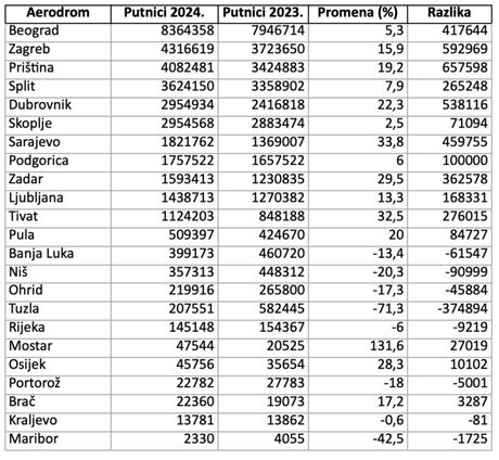 Među aerodromima koji su zabeležili najprometniju godinu u istoriji su Beograd, Zagreb, Priština, Split, Skoplje, Dubrovnik, Sarajevo, Podgorica i Zadar. Beogradski aerodrom ostao je najprometniji u regionu sa 8,36 miliona putnika, dok je Priština zabeležila najbrži rast, dodajući 657.598 putnika u odnosu na 2023. godinu. Istovremeno, Dubrovnik je prestigao Skoplje na listi najprometnijih aerodroma, dok je Sarajevo nadmašilo Podgoricu.