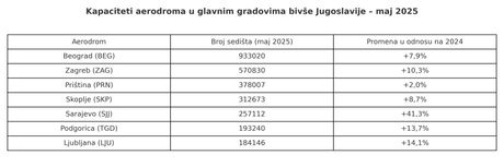 Beogradski aerodrom zadržava lidersku poziciju sa skoro milion ponuđenih sedišta na redovnim linijama tokom maja. Najveći rast u procentima beleži Sarajevo (+41,3%), pre svega zahvaljujući agresivnom širenju Rajanera i rastu kompanije Pegazus erlajns. Zagrebački aerodrom takođe nastavlja sa stabilnim rastom, dok Priština beleži skroman ali stabilan porast od 2%.