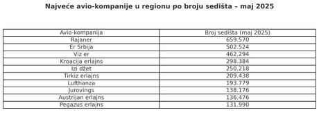 Rast broja sedišta u maju 2025. godine ukazuje na oporavak i širenje avio-tržišta u regionu bivše Jugoslavije, uz rastuću konkurenciju između nacionalnih i niskotarifnih avio-kompanija. Rajaner, Er Srbija i Viz er predvode regionalnu ekspanziju, dok svi glavni aerodromi beleže dvocifreni rast ili stabilizaciju saobraćaja u poređenju sa prošlom godinom.