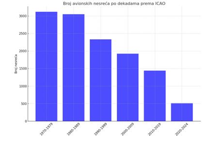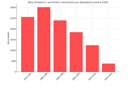 Broj stradalih u avionskim nesrecama po dekadama prema ICAO