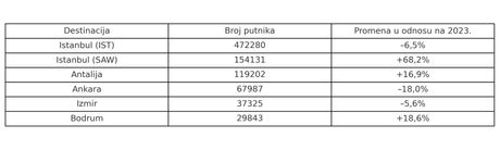 Antalija ostaje najprometnija čarter destinacija iz Beograda, sa 119.202 putnika i rastom od 16,9%, dok su destinacije poput Bodruma (+18,6%) i Izmira (+5,6%) takođe u porastu. Ankara je zabeležila pad od 18%, sa 67.987 putnika.