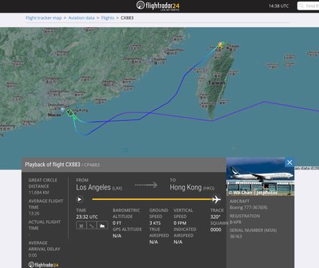 Avion na letu CX883 poleteo je iz Los Anđelesa u 00:55, sa planom da sleti u Hongkong u utorak ujutru. Let preko Pacifika protekao je bez problema, sve do prilaza Hongkongu, kada je avion zbog nepovoljnih vremenskih uslova morao da odustane od sletanja. Meteorološka služba Hongkonga prethodno je izdala upozorenje o „crnoj kišnoj oluji“, koje je kasnije ublaženo na „narandžasto“, ali uslovi su i dalje bili takvi da sletanje nije bilo moguće.