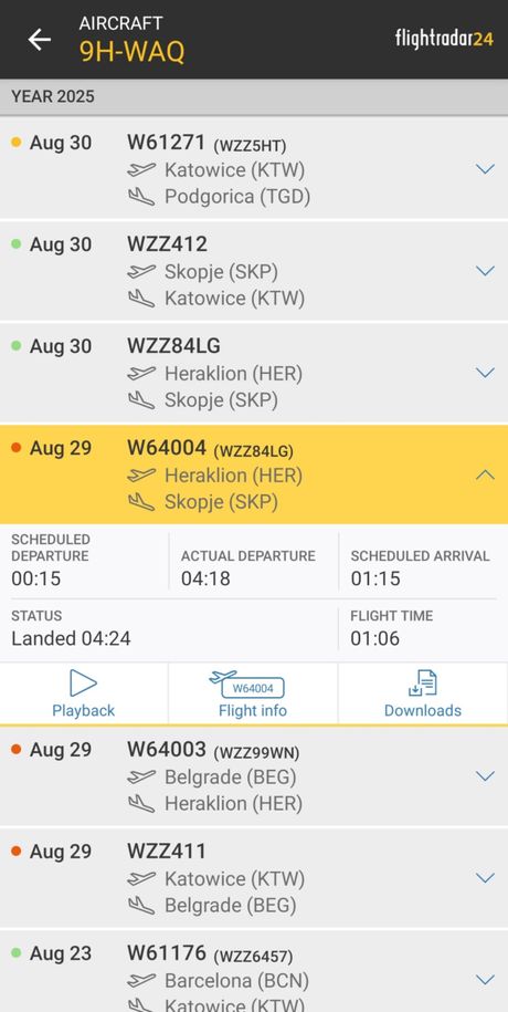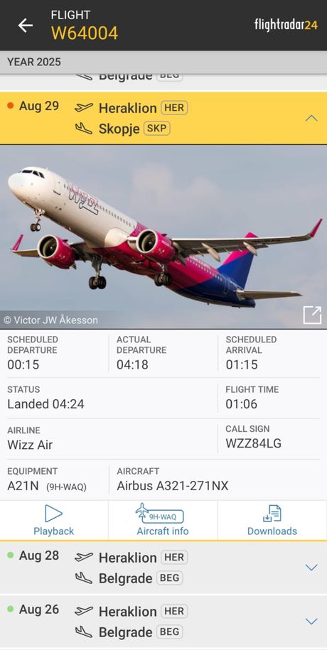 Let W64004 avio-kompanije Viz er (Wizz Air) iz Herakliona za Beograd, zakazan za 29. avgust u 00:15, pretvorio se u višesatnu agoniju za oko 200 putnika iz Srbije. Umesto planiranog sletanja u Beograd u 01:15, avion tipa Erbas A321neo (A321-271NX), registarske oznake 9H-WAQ, poletao je tek u 04:18 i nakon 1 sat i 6 minuta leta, umesto u Beograd, prizemljio se u – Skoplju.