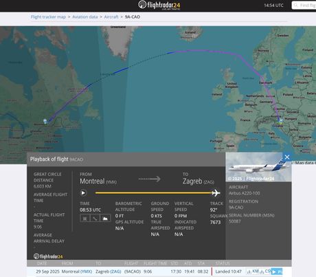 Prema podacima Flightradar24, avion je poleteo iz Montreala (YMX) 29. septembra u 19:41 po lokalnom vremenu, a sleteo u Zagreb (ZAG) danas, 30. septembra, u 10:47 po lokalnom vremenu. Ukupno je proveo 9 sati i 6 minuta u vazduhu, što potvrđuje sposobnosti A220-100 da direktno preleti Atlantik zahvaljujući manjoj masi u odnosu na veću verziju A220-300.