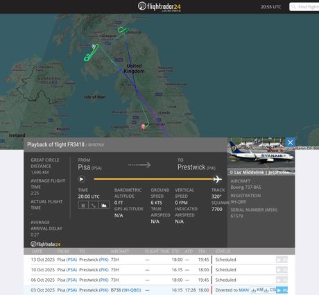 Let FR3418 avio-kompanije Rajaner (Ryanair), koji je u nedelju 5. oktobra leteo iz Pize (PSA) ka Glazgov Prestviku (PIK), proglasio je vanrednu situaciju, "Mayday Fuel" i sleteo u Mančester (MAN) sa svega oko 220 kilograma goriva — količinom ispod bezbednosnog minimuma, saznaje Aero.rs na osnovu izveštaja portala The Aviation Herald i podataka sa sajta FlightRadar24.