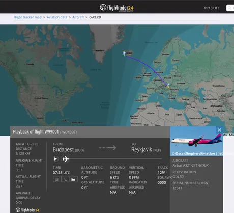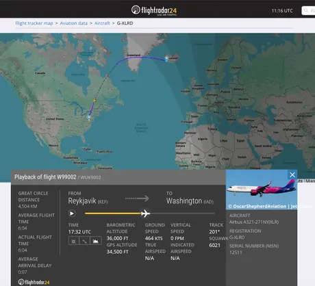 Avion je 6. novembra poleteo iz Budimpešte (BUD) u 08:34 po lokalnom vremenu sa brojem leta W99001, a potom sleteo na Rejkjavik (KEF) u 11:31 radi dopune goriva. Nakon pauze manje od dva sata, let je nastavljen ka Vašingtonu (IAD) kao W99002, gde je sleteo u 14:12 po lokalnom vremenu.