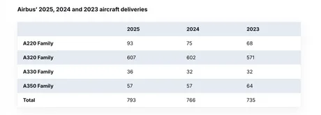 Po porodicama aviona, u 2025. godini isporučeno je 93 A220, 607 aviona iz porodice A320, 36 A330 i 57 A350, što ukupno čini 793 letelice. U poređenju sa 2024. i 2023. godinom, vidljiv je postepen i stabilan rast ukupnih isporuka.