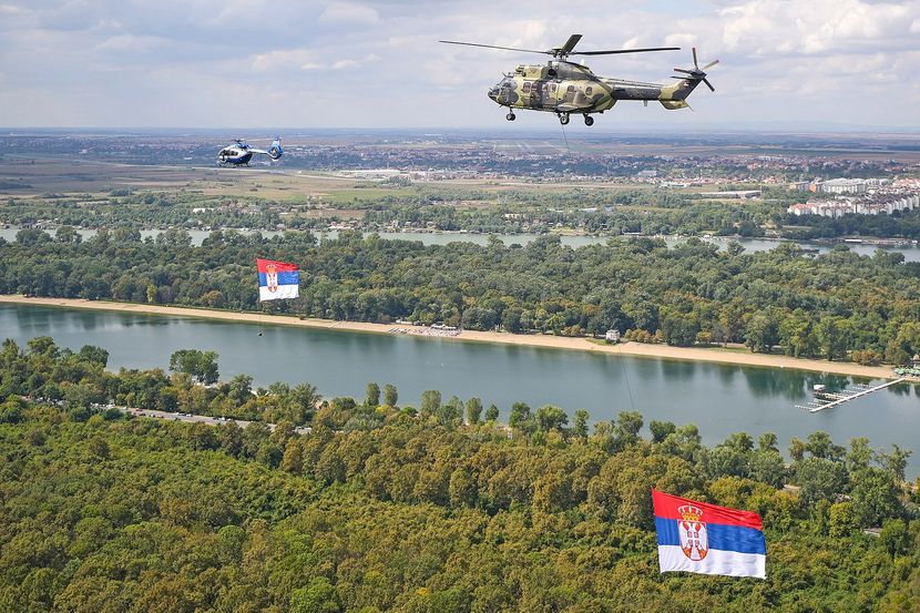 Ljubitelje helikoptera i avijacije sigurno nije ostaviio ravnodušnim prizor neba u zalasku septembarskog Sunca na kome su se ispod dva stara ali pouzdana helikoptera AB-212, čuveni Hjui, i tada još uvek veoma novog H145M, najmodernijeg helikoptera vijorile srpske zastave.
