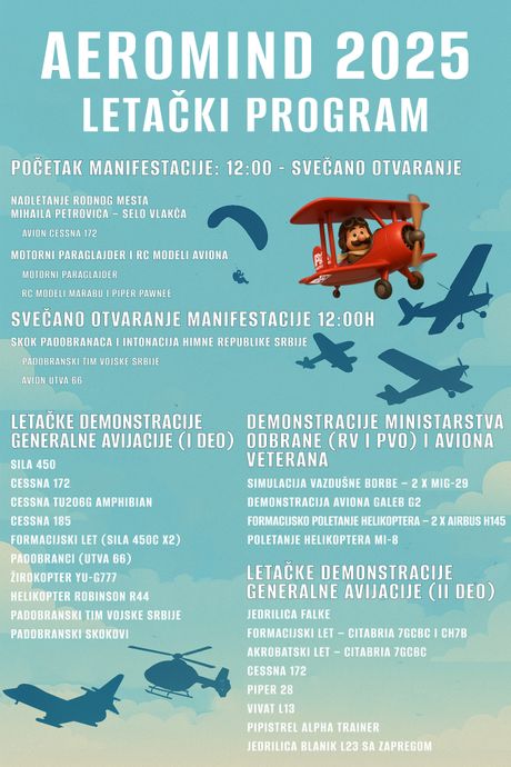 Na privatnom aerodromu MIND, koji se nalazi u okviru istoimenog industrijskog kompleksa na zapadnoj periferiji Kragujevca, u subotu 14. juna će biti održana manifestacija AeroMIND 2025. Ovaj događaj okuplja učesnike iz sveta civilnog, sportskog i vojnog vazduhoplovstva, a program počinje tačno u 12:00 časova.