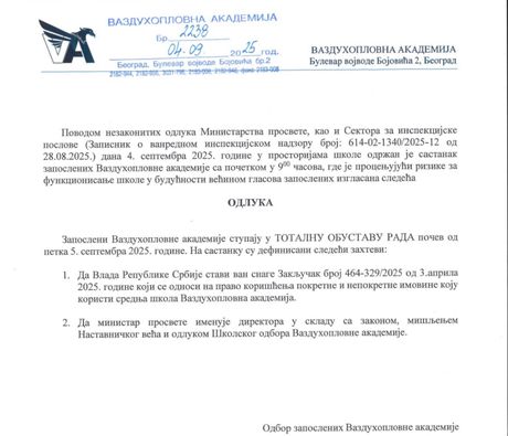 Zaposleni u Vazduhoplovnoj akademiji u Beogradu započeli su štrajk, uz najavu protesta ispred Ministarstva prosvete. Kao glavni razlozi obustave rada navedeni su nezadovoljstvo zbog načina imenovanja rukovodstva škole i odluke Vlade Srbije o korišćenju imovine ustanove.
