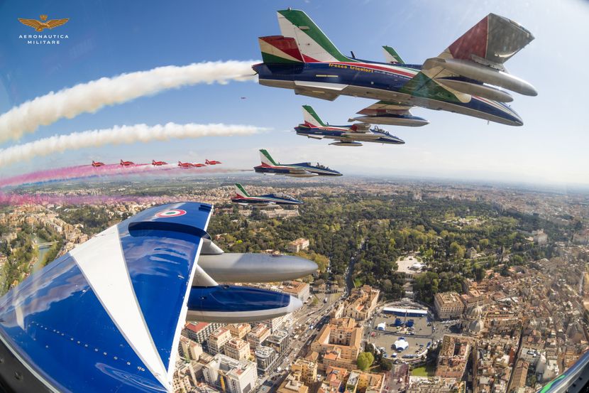 U čast posete britanskog kralja Čarsla i Kraljice Kamile Republici Italiji, u prisustvu domaćina predsednika Serđa Matarele, Rim su u zajedničkoj formaciji nadleteli akrobatski timovi Italijanskog ratnog vazduhoplovstva (Aeronautica Militare, AM) i britanskog Kraljevskog ratnog vazduhoplovstva (Royal Air Force, RAF): Frecce Tricolori i Red Arrows, ukupno čak 16 aviona!