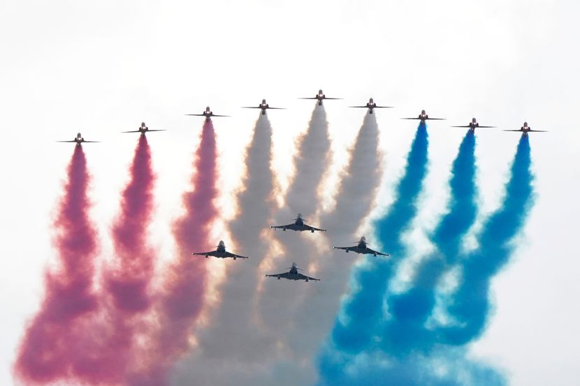 Naravno, kao i uvek na ovakvim manifestacijama, nad Londonom je preletela devetočlana akro grupa Crvene strele (Red Arrows) u svojim Hok T1 avionima, u formaciji sa četiri aviona Eurofajter Tajfuna (voditelj na Skaj televiziji rekao je da se radi o F-35B Lajtning avionima iz baza RAF Vadington i RAF Koningsbaj. S obzirom na to da su ovu informaciju preneli i drugi mediji - moguće je da je u pitanju greška kancelarije za odnose s javnošću, jer se na snimcima jasno vide Tajfuni, op. aut.).